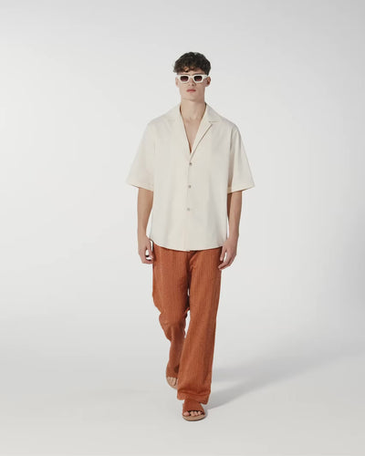 Sharp silhouette shirt with boxy fit and wide 3/4 sleeves. Made of pure Italian canvas cotton. Featuring a deep bowling collar, slightly dropped shoulders and double vents on the back, offering a perfect blend of style and comfort. This piece is ideal for layering over a tank top or wearing on its own, making it a fresh and versatile garment for spring-summer time. Let this shirt tell your story of style and adventures.