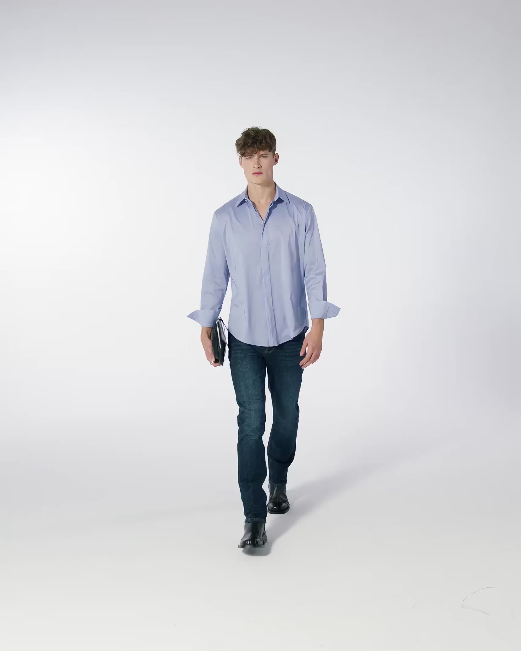 In pure Italian poplin cotton enriched with a touch of elastane to provide the right elasticity and enhance comfort. Regular-slim fit. Refined handcrafted details: Italian collar; mother-of-pearl buttons; hidden button placket; rear yoke; slight sidecut on the back; rounded bottom and classic two-button cuff.