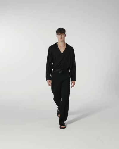 Wrap yourself up in the silky touch of this satin shirt, a dream of softness and fluidity. Inspired by the traditional Japanese Kimono. Featuring a deep V-neck collar and an elegant shawl collar. Buttonless, just an internal and external lacing to suit every silhouette. Sophisticated unisex bold garment, suitable for those who love to stand out with elegance.