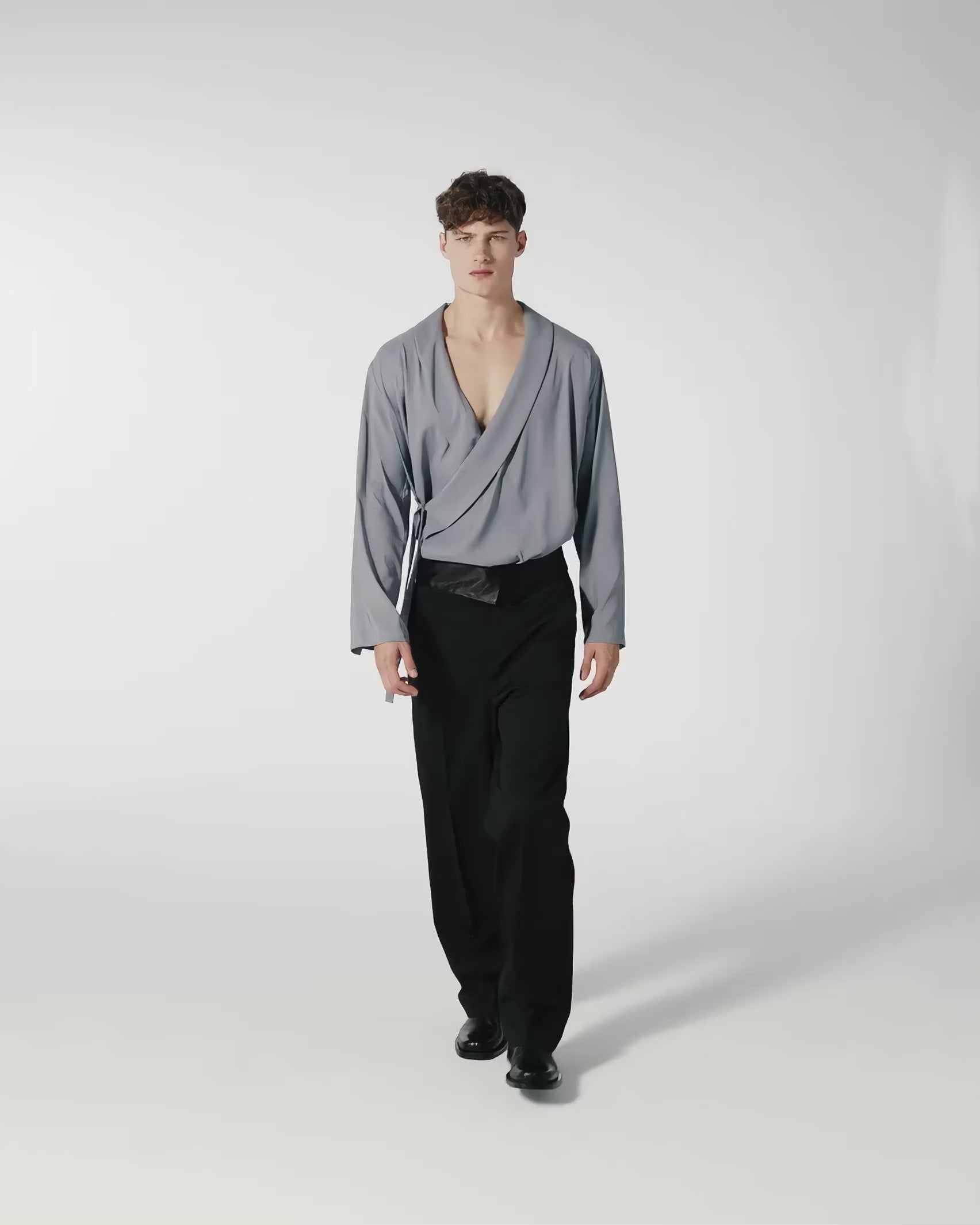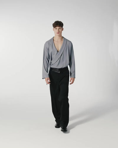 Wrap yourself up in the silky touch of this satin shirt, a dream of softness and fluidity. Inspired by the traditional Japanese Kimono. Featuring a deep V-neck collar and an elegant shawl collar. Buttonless, just an internal and external lacing to suit every silhouette. Sophisticated unisex bold garment, suitable for those who love to stand out with elegance.